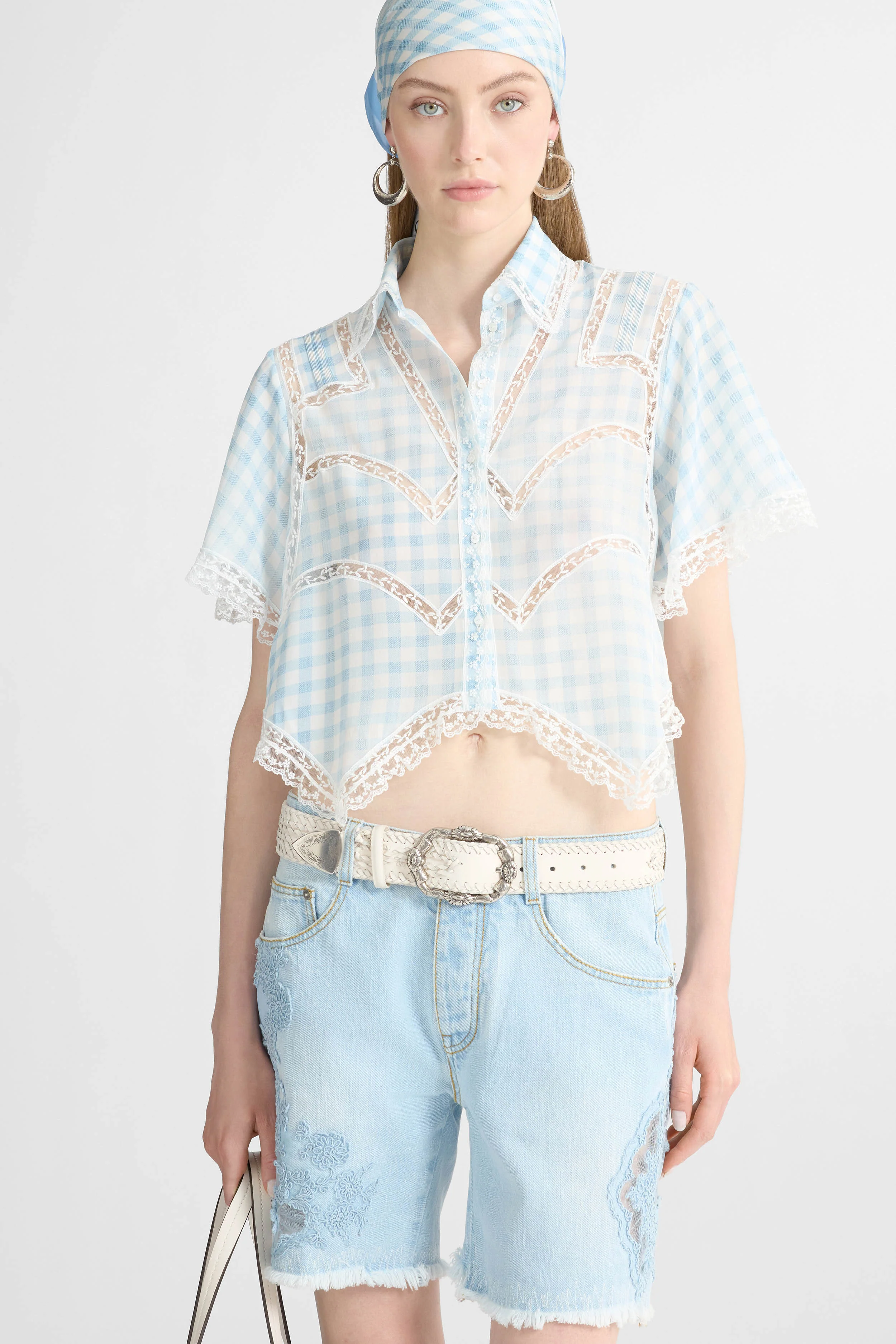 Cropped Silk Shirt with Blue Vichy Print and Valencienne Lace