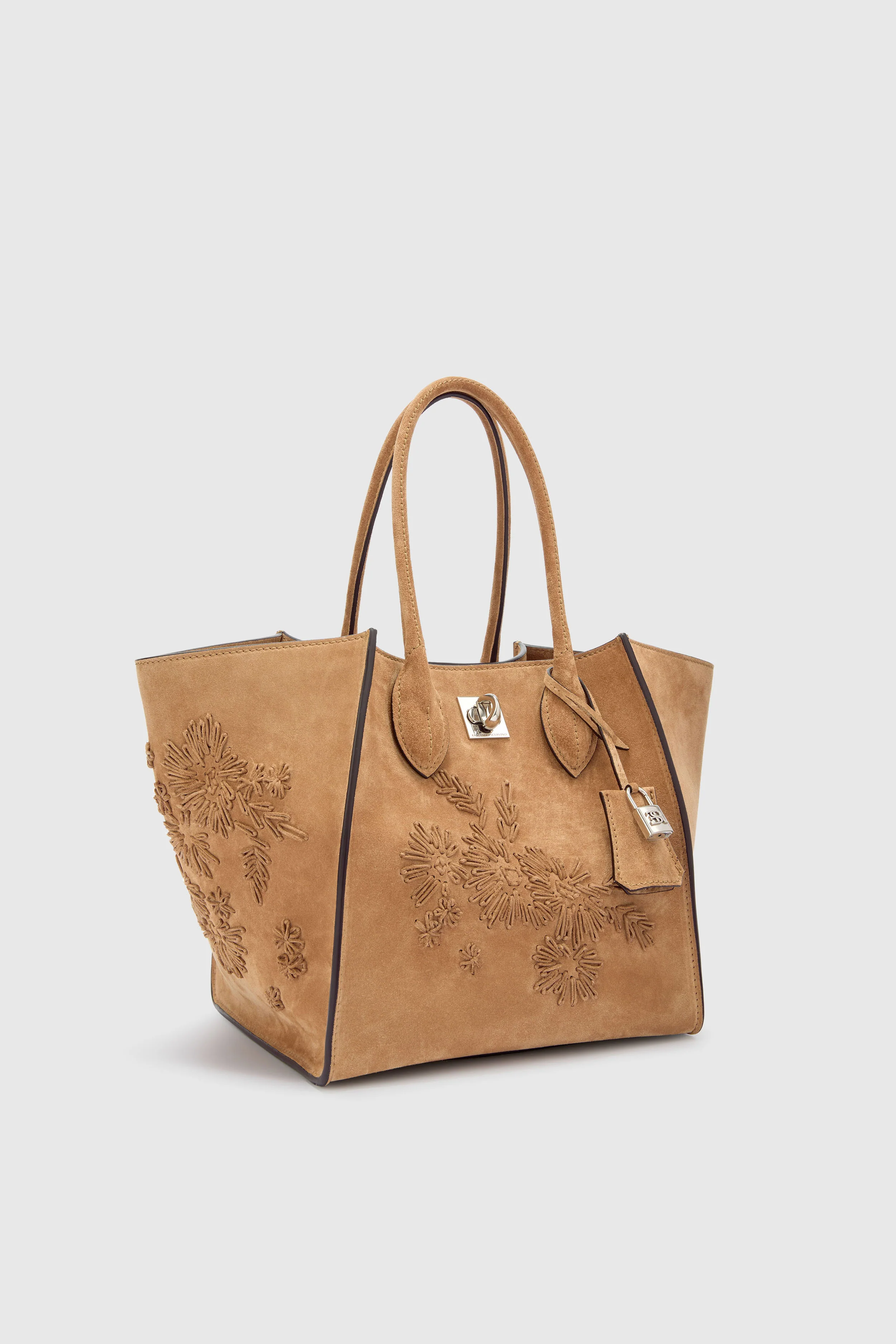 The Maggie Medium is a double-handle bag in suede calfskin, adorned with hand-embroidered floral motifs using matching suede strips. The signature personalized turn-lock closure is paired with a logo three-dimensional padlock, adding style and security. Metal feet protect the base, while the strap and trim in suede calfskin complete the accessory, along with a practical crosta pocket. A perfect balance of elegance, craftsmanship, and functionality.