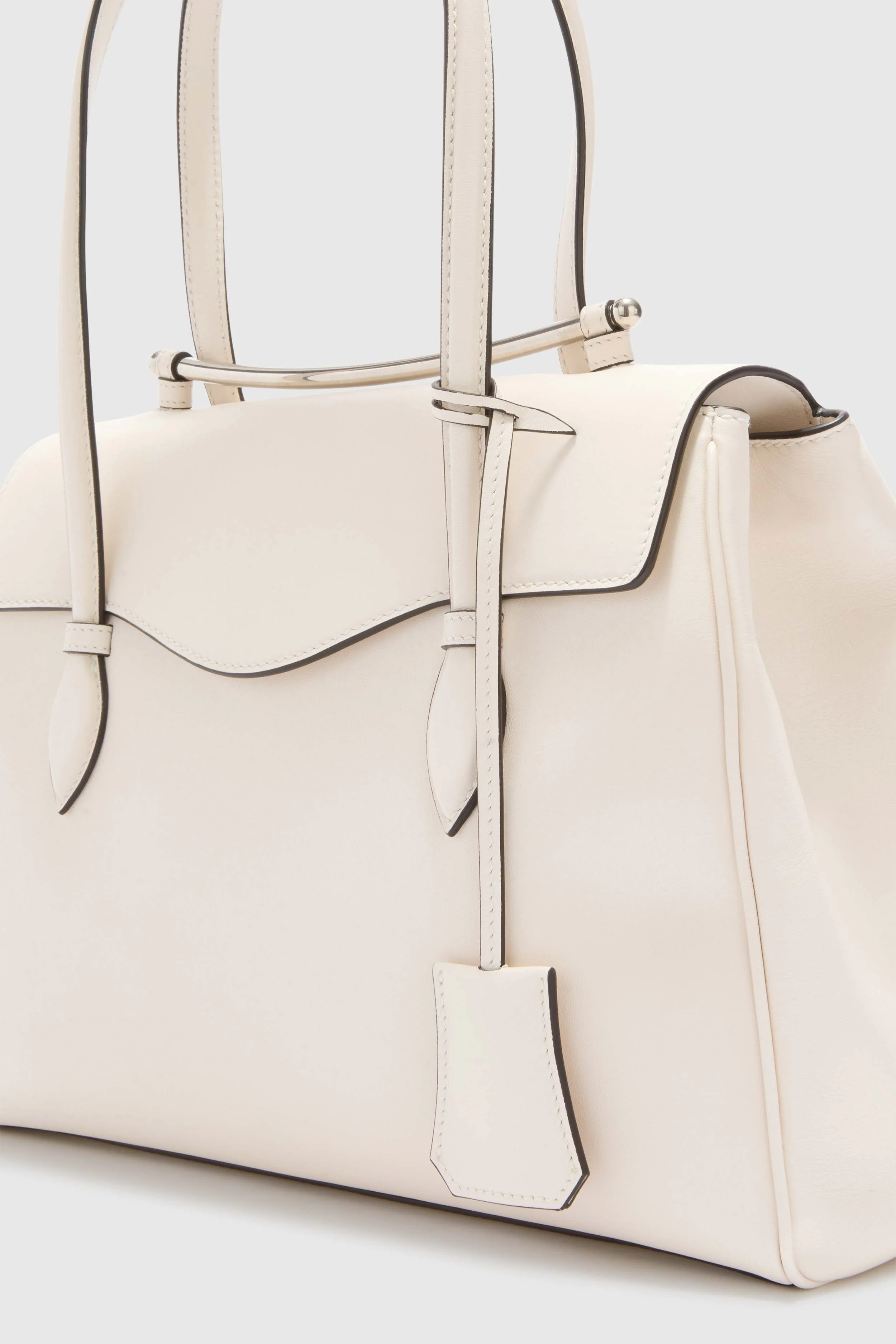 The Music bag is a contemporary reinterpretation of the top handle bag, inspired by vintage sheet music holders. Its arched metal clasp with engraved logo, small flap secured by leather-covered magnets, and protective metal feet combine functionality with sophistication. Crafted from top-quality collectible calf leather with a natural finish, the minimalist design emphasizes clean lines and the exceptional quality of the materials. Perfect for daily use, this bag unites style, comfort, and versatility in one refined accessory.